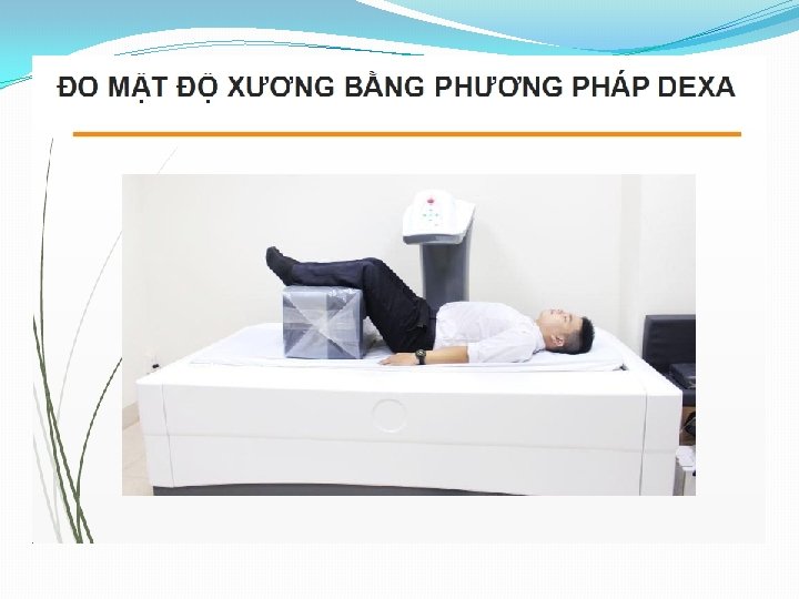 CHẨN ĐOÁN LOÃNG XƯƠNG Đo khối lượng xương : �Đo hấp thụ photon đơn ( single photon absorptiometry – SPA). �Đo hấp thụ photon kép (dual photon absorptiometry – DPA). �Siêu âm định lượng (quantitavive ultra sound – QUS) �Chụp cắt lớp vi tính định lượng( quantitative computed tomography – QCT) �Đo hấp thụ tia xạ X năng lượng kép ( dual energy X ray absorptiometry – DEXA)