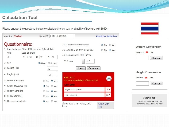 MÔ HÌNH FRAX ( Fracture risk assessment tool) (http: //www. shef. ac. uk/FRAX/index. aspx) DỰA VÀO 12 YẾU TỐ NGUY CƠ: • Tuổi, giới • Chiều cao, cân nặng • Tiền sử gãy xương • Tiền sử cha mẹ gãy xương hông • Hút thuốc lá, uống rượu trên 3 U/ ngày • Sử dụng corticoid • Viêm khớp dạng thấp • Loãng xương thứ phát • Mật độ xương cổ xương đùi
