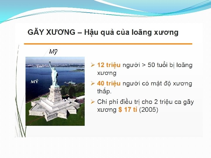 HẬU QUẢ CỦA LOÃNG XƯƠNG Gãy xương, đặc biệt là gãy cột sống gây ra cơn đau mãn tính và tàn phế do đau Gãy xương vùng khớp háng làm gia tăng tỉ lệ tử vong từ 10 – 20% trong năm đầu tiên sau gãy xương và làm tăng đến 2, 5 lần nguy cơ gãy xương tiếp theo trong tương lai