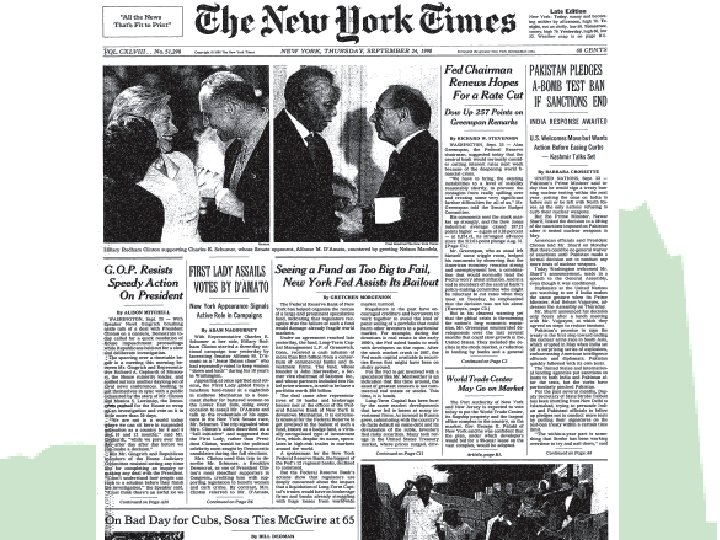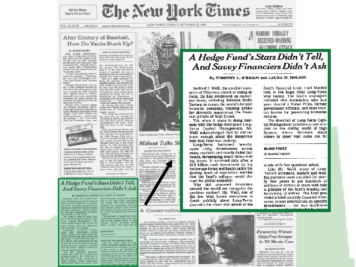 LOANS ES S PR BA U O IL $ = T B 6. 3 E Black UR Bond ce perien g ex tradin Scholes ther % o 40 t p U rns retu iwe Merton Mullins INVESTMENTS Up to $1 trillion in derivatives LTCM $1. 25 billion up to $7 B down to $555 M PRES SURE LOANS