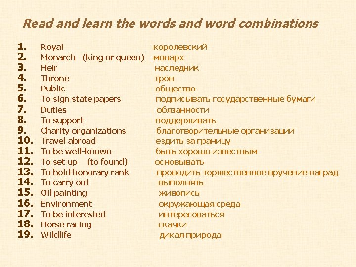 Complete the sentences using the words in the box monarch, royal heir, throne, reigns, Prince (x 2), charity organizations, was crowned, Princess, became, oil painting 1. The present … is Elizabeth II. 2. The eldest son … Charles, the … of Wales is the … to the …. 3. Elizabeth … the sovereign in 1952 when her father, King George VI died. 4. She … but doesn’t rule the country. 5. Elizabeth II … …. in 1953. 6. Prince Philip likes …. 7. The Queen’s children and husband help her working with … ….