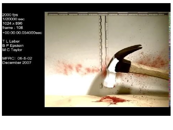 Medium Velocity Blood Splatters • The characteristics of a medium velocity spatter consists of small drops with diameters of 1 -3 mm. they travel at an average of 5 to 25 ft/s • They are commonly associated with blunt force trauma.