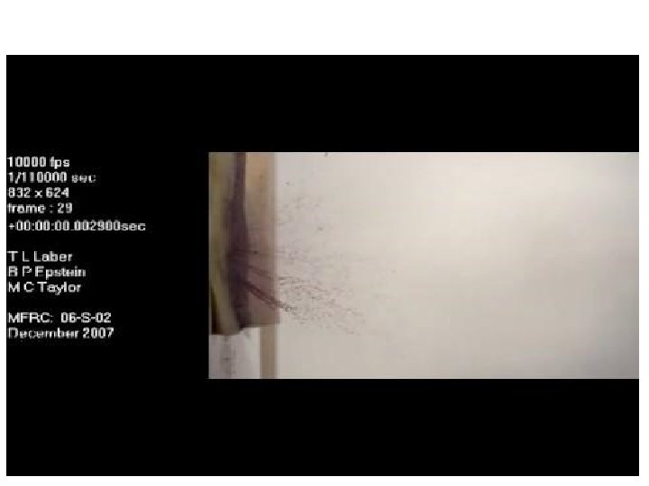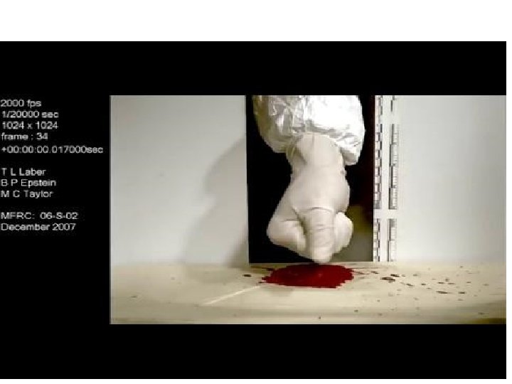 High Velocity Blood Splatters • The characteristics of a high velocity spatter are that it consists of drops with diameters of less than 1 mm. This blood spatter hits at more than 100 ft /s. Gunshot spray.