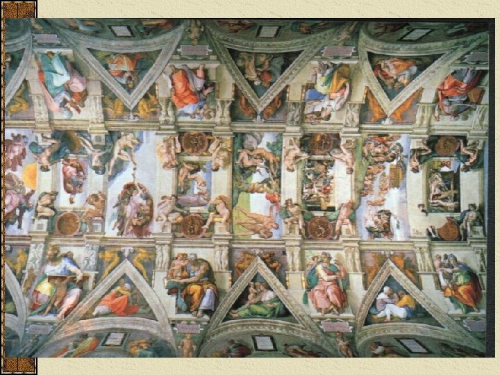 *Ceiling of the Sistine Chapel by Michelangelo *Interior view of the Sistine Chapel, which was built during the rule of Pope Sixtus IV. The chapel is famous for its elaborate interior decoration, epitomized by the sequence of paintings on the ceiling by Renaissance artist Michelangelo. The series of images, renowned for their depth, detail, and color, comprises nine scenes from the Biblical book of Genesis.
