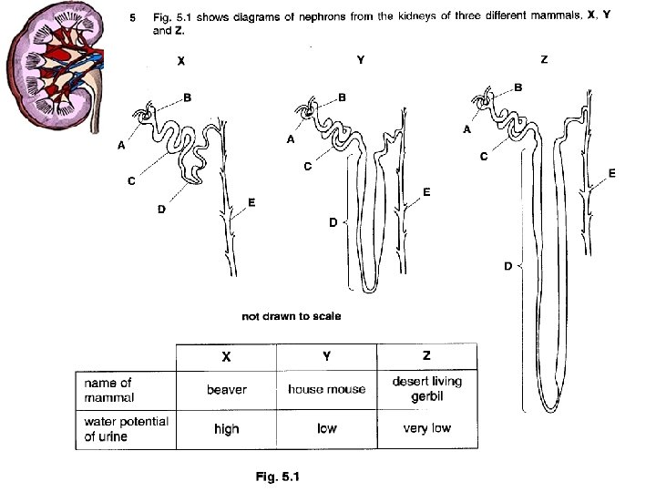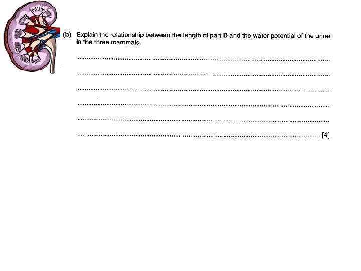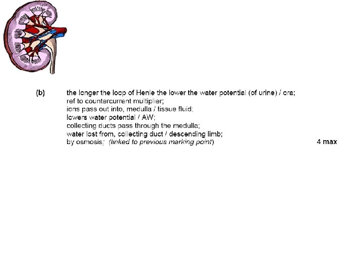 Loop Of Henle • Important Facts: • In the descending limb the water potential of the fluid is decreased by the addition of mineral ions and the removal of water • In the ascending limb the water potential is increased as mineral ions are removed by active transport • Ascending limb is impermeable to water