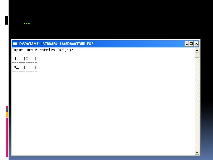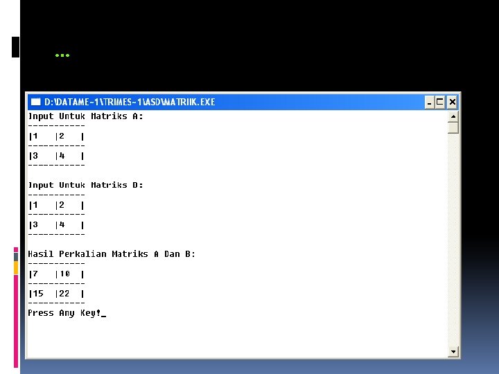 … Menampilkan Isi Array 2 Dimensi: for ( baris=1 ; baris<=3 ; baris++) { for ( kolom=1 ; kolom<=3 ; kolom++) { printf("t. Matrik elemen [%d, %d] = %d", baris, kolom, matrik[baris][kolom]); } printf("n"); }