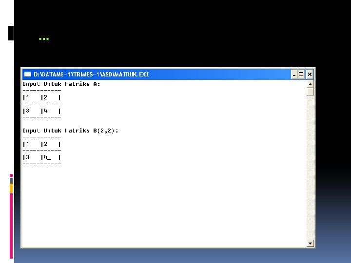 … for ( baris=1 ; baris<=3 ; baris++) { for ( kolom=1 ; kolom<=3 ; kolom++) { printf("t. Masukan matrik elemen [%d, %d] = ", baris, kolom); scanf("%d", &matrik[baris][kolom]); } }
