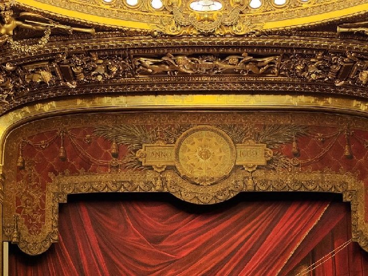 Salle La grande salle de spectacle constitue le cœur même du palais. Épousant une forme en fer à cheval, avec ses balcons, ses loges et ses stalles sur cinq niveaux avec sa galerie supérieure, l'endroit est conçu suivant le modèle des théâtres dits « à l'italienne » . Garnier veut innover en concevant une salle proportionnellement plus petite que le volume gigantesque abritant les dispositifs scéniques. Ses caractéristiques dimensionnelles demeurent néanmoins impressionnantes : près de trente et un mètres de largeur, trente-deux mètres de profondeur sur vingt mètres de hauteur. Sa jauge s'approche des deux mille places assises, avec un peu plus de mille neuf cents fauteuils. Ce lieu prestigieux est habillé dans des tons dominants de rouges et d'ors. Le cadre et le rideau L'ouverture du cadre de scène est telle qu'elle autorisait autrefois l'arrivée de chevaux au galop dans la largeur de ses seize mètres. Le rideau de scène, au drapé rouge et or et peint en trompe-l'œil, est surmonté d'un imposant lambrequin présentant, en son centre, un cartouche. Une devise y figure, choisie par Garnier lui-même, et la mention « ANNO 1669 » rappelle l'époque de la création de l'Académie royale de musique. Légendes et anecdotes Le jour de la présentation officielle des plans au concours d'architectes, l'impératrice Eugénie, favorable à Viollet-le-Duc, apostrophe Garnier avec cette question : « Quel est donc ce style ? Ce n'est pas du grec, ni du Louis XVI ! » . Ce à quoi Charles Garnier répond : « C'est du Napoléon III et vous plaignez ! » . L'empereur prend alors à part Charles Garnier et lui murmure : « Ne vous en faites pas, elle n'y connaît rien ! » ; le style Napoléon III était né ! La légende d'un lac souterrain a été entretenue par le célèbre roman de Gaston Leroux : le Fantôme
