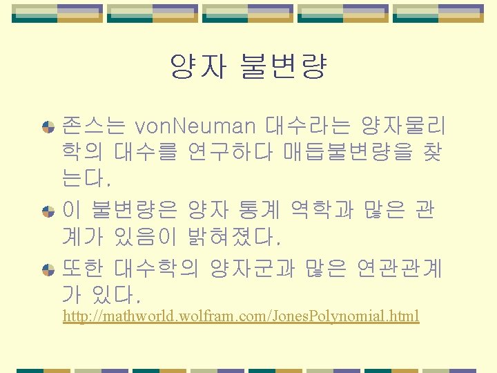 게이지장이론과 위상수학 20세기 물리학의 중요문제는 입자의 기 본구조를 밝히는 것이 였다. 최종적으로 quark model이 승리하였다. 이 모델은 리군 SU(3, R)의 표현을 사용 하여 기본 입자를 이해한다. http: //blueflag. phys. yorku. ca/yhep/main. html http: //hyperphysics. phy-astr. gsu. edu/hbase/particles/quark. html http: //particleadventure. org/particleadventure/frameless/startstandard. html http: //www. phys. ufl. edu/~acosta/phy 3101/quarks/index. htm
