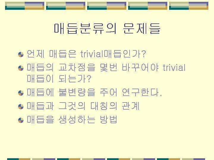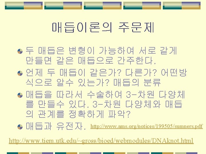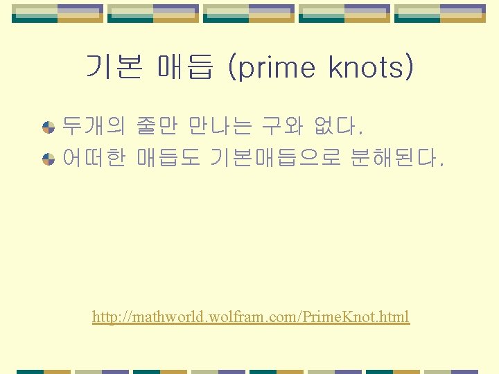 교차수를 따른 분류 교차수란 knot diagram의 최소의 교차 점의 수를 말한다. 10까지. Alexander 와 Briggs (8), Reidemeister(9), Perko (1974) (10) http: //www. math. toronto. edu/~drorbn/KAtlas/Knots/index. html