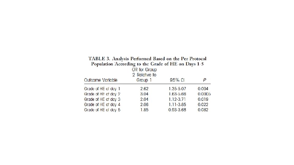Primary outcomes • Primary analysis (Intention-to-treat, Nges=193, n 1=98, n 2=95) on grade of HE at 5 days: no significant difference between the two groups at 5 -day follow-up (OR 1. 44, 95%CI, 0. 81 -2. 56, P=0. 21) • Per protocol primary analysis (includes only patient stayed eligible for treatment, Nges=162, n 1=83, n 2=79): no significant difference between the two groups at 5 -day follow-up (OR 1. 73, 95%CI, 0. 87 -3. 42, P=0. 12) • but: significantly lower grade of HE during days 1 -4 in LOLA group