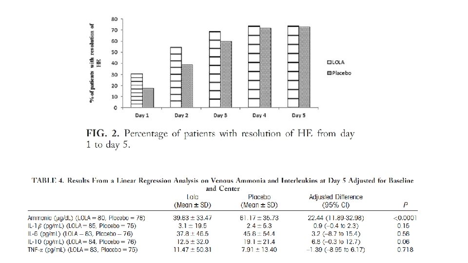 Secondary outcomes • significant decrease in venous ammonia levels in LOLA group compared to placebo (referring to baseline and day 5) • significant reduction of length of hospital stay (8. 41± 4. 41 days in LOLA group, 11. 45± 5. 25 days in placebo group, OR 3. 08, 95% CI 1. 77 -4. 40, P<0. 0001) • significant shortening of recovery time from OHE in LOLA group (1. 92± 0. 93 days vs. 2. 50± 1. 03 days) • no significant difference in inflammatory response (no significant alteration in interleukin and TNF-α-levels) • no significant difference in mortality rate or failure rate between the two groups • no significant difference in adverse events between the two groups • Similar mortality rate after 1 month follow-up (baseline MELD-Score 21 for both groups)