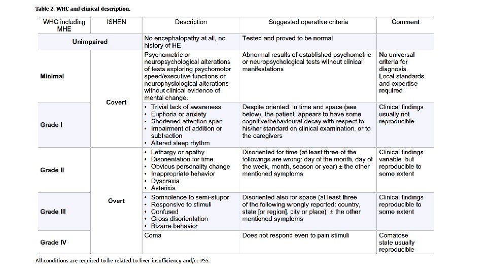 Hepatic encephalopathy (HE) • Definition: HE is a brain dysfunction caused by hepatic insufficiency and/or portosystemic shunting. • Symptoms: wide range of neurological or psychiatric abnormalities (ranging from subclinical alterations to coma) • Clinical landmark in cirrhotic patients that marks the decompensated stage of the disease (like ascites, or variceal bleeding) • High recurrence rate after first bout of HE • High mortality due to severe overt HE