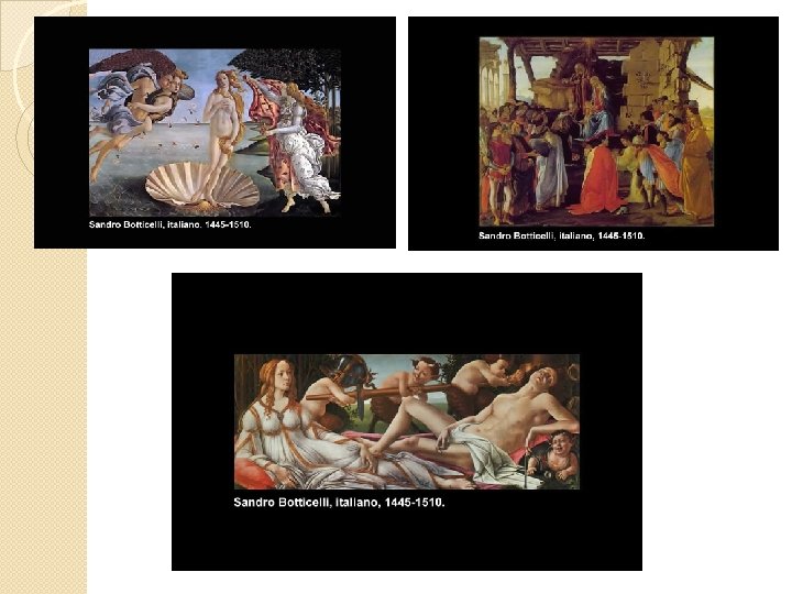 Sandro Botticelli (1445 -1510) �Nació en Florencia, Italia. Pintor líder del renacimiento florentino que desarrolló un estilo personal caracterizado por línea marcada y elegante. Botticelli pasó su vida pintando retratos y cuadros por encargo de las familias prominentes de Florencia. También realizó obras religiosas, de las cuales destacan sus Madonnas y pinturas al fresco realizadas en la Capilla Sixtina del Vaticano.