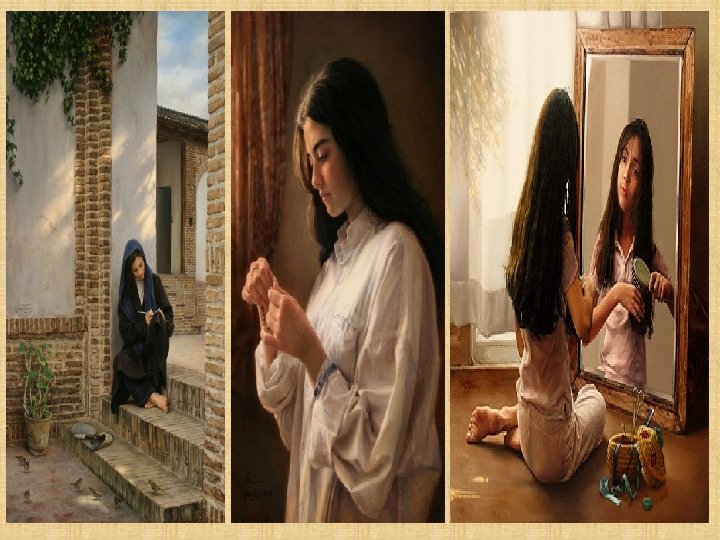 Malei ¤ Iman Maleki ¤ 1976, Teherán ¤ Pintor iraní del hiperrealismo. ¤ Genio de la pintura realista contemporánea ¤ Plasma en sus lienzos escenas cotidianas de su país natal: Irán, niños, muchachas de expresión taciturna o meditabunda, mujeres ataviadas con velos y prendas vaporosas en actitud relajada