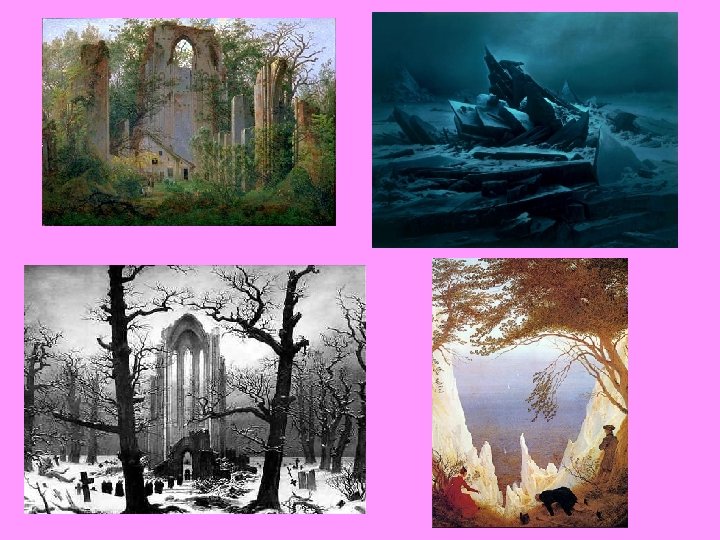 CASPAR DAVID FRIEDRICH Pintor alemán del siglo XIX. Nació el 5 de septiembre de 1774 en Greifswald y estudio en la academia de Copenhague. Sus primeros dibujos ya exploraban motivos que serían recurrentes a lo largo de su obra, playas de rocas, llanuras planas y desnudas, cadenas montañosas infinitas y árboles que se elevan hacia el cielo. Mas adelante su obra comienza a reflejar cada vez más la respuesta emocional del artistas frente a los escenarios naturales. Comenzó a pintar al óleo en 1807. Su fama declinó tras su muerte.