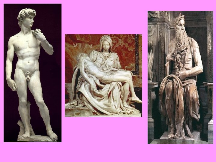 MIGUEL ÁNGEL Miguel Ángel Buonarroti nació en el pequeño burgo de Caprese en 1495. En sus primeros años dedicados a la escultura, se remontan dos obras de Miguel Ángel: "Madonna della escala“ (virgen de la escalera) y la "Battaglia dei Centauri“ (batalla de los centauros) realizadas alrededor de 1492. En este mismo año murió su protector Lorenzo dei Medici. Esta muerte provocó un gran dolor a Miguel Ángel. Debido a esto y a la desaparición de Lorenzo il Magnífico hizo que cambiara profundamente el espíritu y el amor por el arte, sobre todo había cambiado el clima político. Miguel Ángel muere en 1564, en Trajano. Un mes antes de su muerte , el papa Pío IV ordenó a Daniele da Volterra que cubriera la desnudez del Juicio: el papa consiguió con ello el deshonor y Daniele un epíteto que no le abandonaría nunca y que podría traducirse por "calzonazos".
