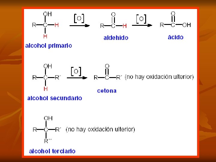 CH 3 CH 2 CH 2 OH+KMn. O 4 CH 3 CH 2 CHO+Mn. O 2 ALDEHÍDO CH 3 CHCH 2 CH 3+KMn. O 4 CH 3 CCH 2 CH 3+Mn. O 2 (s) OH O CETONA El agente oxidante es el KMn. O 4 que es de color morado o púrpura, debido a que el Mn se reduce de +7 a +4 se forma Mn. O 2 de color café o ámbar (s)