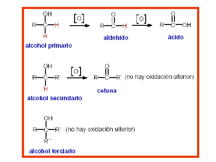 CH 3 CH 2 CH 2 OH+KMn. O 4 CH 3 CH 2 CHO+Mn. O 2 ALDEHÍDO CH 3 CHCH 2 CH 3+KMn. O 4 CH 3 CCH 2 CH 3+Mn. O 2 (s) OH O CETONA El agente oxidante es el KMn. O 4 que es de color morado o púrpura, debido a que el Mn se reduce de +7 a +4 se forma Mn. O 2 de color café o ámbar (s)