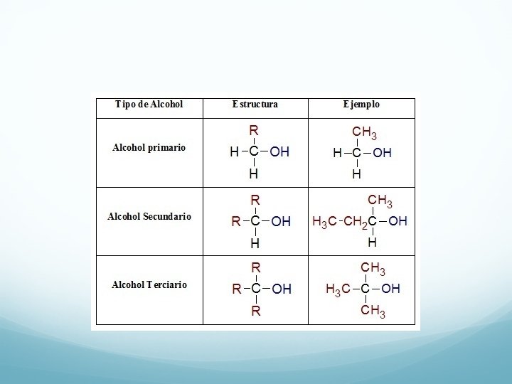 Primarios, Secundarios y Terciarios Depende de que tengan uno, dos o tres átomos de carbono enlazados con el átomo de carbono al que se encuentra unido el grupo hidróxido Un alcohol es Primario, si el átomo de hidrogeno (H) sustituido por el grupo oxidrilo (-OH) pertenece a un carbón (C) primario: