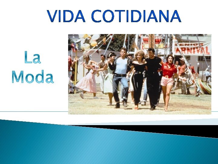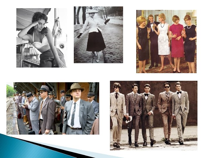LOS AÑOS 50 Los primeros años de la post-guerra devolvió a la mujer al hogar, a las tareas de la casa y a volver a pensar en sí misma. En los años 50, el mundo dejaba una etapa atrás y la moda también lo reflejó. Desde entonces, la mujer volvió a preocuparse por su belleza, por su estética y el vestir. Debía ser una excelente ama de casa, esposa, mamá y mujer. Todo ello debía quedar reflejado en su cuidado y aspecto. Vestidos ceñidos a la cintura, sujetadores armados, faldas por debajo de la rodilla. La mujer quiere volver a ser sensual, quiere dejar en manifiesto sus curvas, pero sin ser muy provocativa. Ante todo está el buen gusto, así es la esposa ideal. La mujer debía ir siempre correctamente maquillada, y comenzaron a valorizarse mucho el uso de accesorios: guantes, tocados, los bolsos eran el complemento indispensable de todo atuendo. � Los hombres en esta época eran más conservadores, el atuendo del lugar de trabajo era tradicionalmente un mar de color azul oscuro, marrón, colores gris y negro. Un mar de hombres con trajes de etiqueta y sombreros de copa.