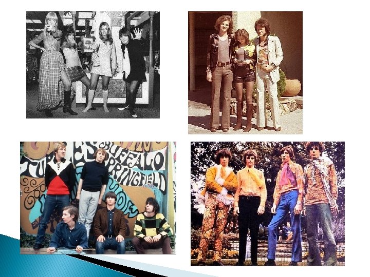� � LOS AÑOS 60 Una década importante para el mundo entero, grandes cambios para la moda. Pero hay algo que resalta, una prenda que marcó un antes y después para la mujer: la minifalda. Es increíble pensar que antes de los 60’s, las mujeres no usaban faldas por encima de la rodilla, pero lo cierto es que las chicas comenzaron a mostrar sus piernas, y a ser algo más atrevidas gracias al ingenio y el atrevimiento de Mary Quant, una modista británica que dio origen a la minifalda. 15 cm sobre la rodilla, así quedó definido el lugar que ocuparía la minifalda, desde que se mostró al mundo por primera vez el 10 de julio de 1964 en un desfile en el que Mary Quant presentó su colección de verano. De esa década el símbolo por excelencia de la moda de los años 60. Junto con la minifalda se impuso el modelo de mujer extremadamente flaca, encabezada por la famosa modelo Twiggy, quién aprovechó su figura para lucir sus largas y flacas piernas bajo la minifalda. Completaba este nuevo look medias estampadas y botas altas hasta por encima de la rodilla. En los hombres se pone muy de moda el corte de pelo de los Beatles , el uso del jersey la mayoría de estos con cuello largo, y pantalones de mezclilla o de cotelé. Zapato tennis de lona o bien zapatos de vestir muy conservadores en negro o café.