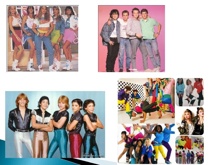 LOS AÑOS 80 � Los años 80 para la moda fueron años de diseños revolucionarios, colores casi fluorescentes. � Otra de las característica de esta década fue el uso de chaquetas con hombreras, vestidos metalizados, botas altas por encima de la rodilla, guantes largos, mucho cuero negro, cinturones a la cintura. “Volver al pasado” parece que son las tendencias para las nuevas temporadas que se vienen. La moda de los hombres en esta época era llevar el traje deportivo, pero en el armario de un hombre no podían faltar los jeans rotos o descosidos, las camisas, anudadas a la cintura y botas militares con hebillas y plataformas.