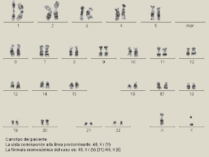 Cromosoma sexual en anillo “Y” • Desarrollo psicomotor y desempeño intelectual fueron normales. • Características físicas: -Presentó retardo en el crecimiento. -Su talla a los 10 anos- 117 cm. -Peso a los 10 años---- 24 kg. -Cara rectangular, cuello corto, implantación baja de pelo de la nuca, etc.