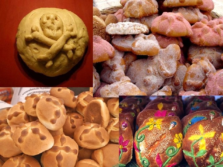 • Often on el Día de Los Muertos, families will set up altars, or ofrendas, to honor their departed loved ones. • The ofrendas are prepared with much love and care. They will include the departed´s favorite foods and drinks, and often many of the departed´s favorite items from life. Candles, flowers, and Papel Picado are also used to decorate the altar. • One important feature that is almost always included is the Bread of the Dead. This is a sweet bread, made of flour and eggs, and often shaped in the form of a circle with a skull and crossbones, although it can have other forms as well. • One reason for the start of this tradition may have to do with an old Spanish saying “El muerto al hoyo y al vivo al bolla. ” Or literally the dead to the grave and bread to the living. So including bread on the altar for the dead is denying the power of death, at least for the day.