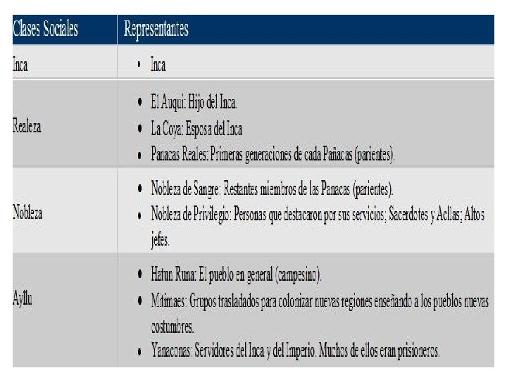 Social classes • The Inca nobility was greatly privileged and those related to the Inca himself held the highest positions. The nobility were all drawn from the ten royal ayllus. • In addition, the residents of Cuzco were given noble status to enable them to serve in high bureaucratic posts. • The nobles were distinguished by dress and custom. Only they were entitled to wear the large ear spools that enlarged the ears and caused the Spaniards to later call them orejones, or "big ears. " • Noticeably absent in most of the Inca Empire was a distinct merchant class. Unlike Mesoamerica where long-distance trade was so important, Inca emphasis on self- sufficiency and state regulation of production and surplus limited trade. • Only in the northern areas of the empire, in the chiefdoms of Ecuador, the last region brought under Inca control, did a specialized class of traders exist.