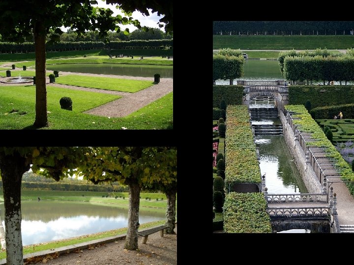 El jardín del agua. : Situado en la parte mas elevada del terreno este jardín es de inspiración clásica. Se centra alrededor de un gran estanque busca su función reflejante como un espejo reflejante, que a su vez aparece rodeado de praderas, plantas y árboles verdes, tilos recortados.