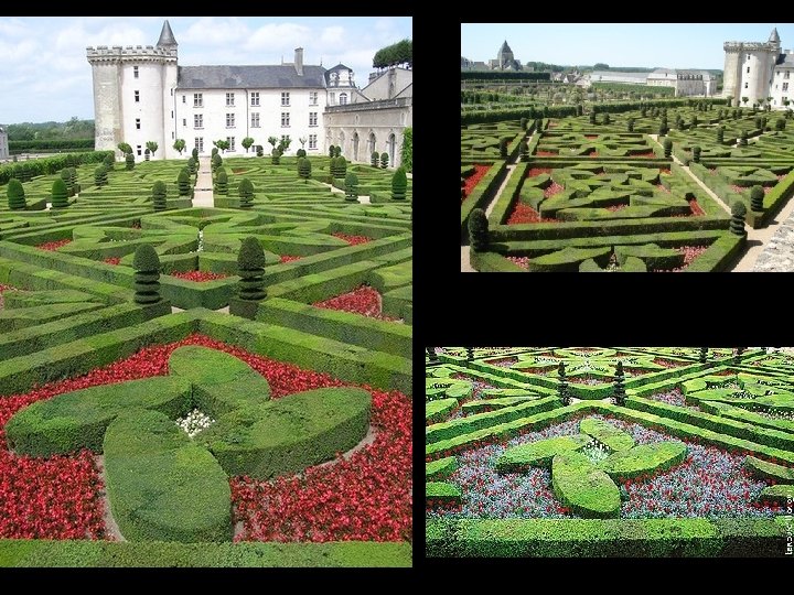 El jardín del amor. : Nos ofrece su mejor vista desde la torre del castillo. Constituido por cuatro cuadrados de formas geométricas que representan el amor en sus distintas fases. : el amor tierno, el amar apasionado, el amor infiel y el amor trágico……. . Obsérvese los cuatro corazones en el centro y a la derecha. Todas las formas están hechas con macizos de boj, que se podan cada año en Septiembre y Octubre, además de flores de color, blanco de la inocencia y la ternura, rosa del amor y rojo de la traición y la sangre.