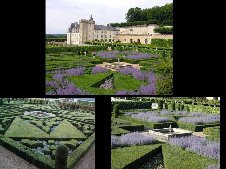El jardín de la Música. : Este tercer salón de boj evoca de forma simbólica la música. Los grandes triángulos representan liras, arpas, candelabros…. . Entre el boj crecen en primavera plantas de lavanda que dan a este parterre un aspecto espectacular.