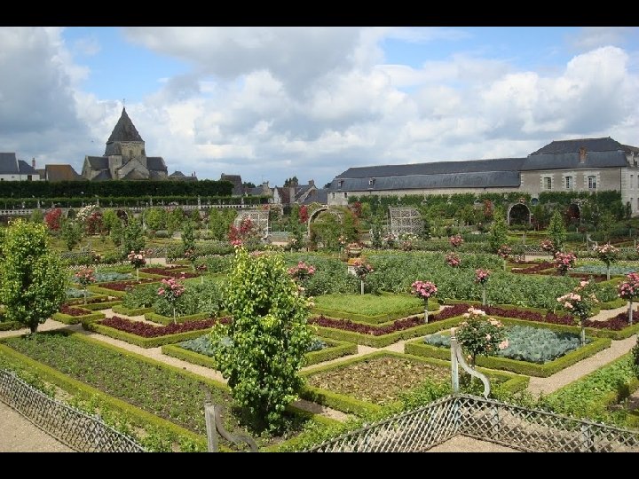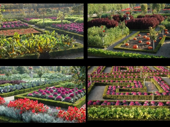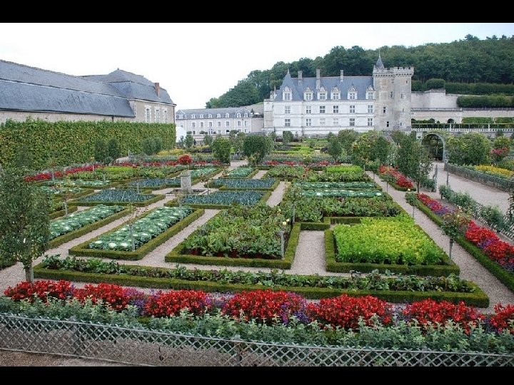 El huerto. : En la terraza mas baja, entre el castillo y el pueblo de Villandry, se encuentra el jardín de los vegetales, quizá la parte mas famosa de los jardines de Villandry. Diseñado al modo renacentista, consta de 9 cuadros de igual tamaño pero con diferentes patrones geométricos. Están plantados con hortalizas de colores contrastados, buscando dar una impresión de variedad. : el azul del puerro, el blanco del repollo, el morado de las lombardas y la remolacha, el verde de la lechuga y las matas de zanahorias…….