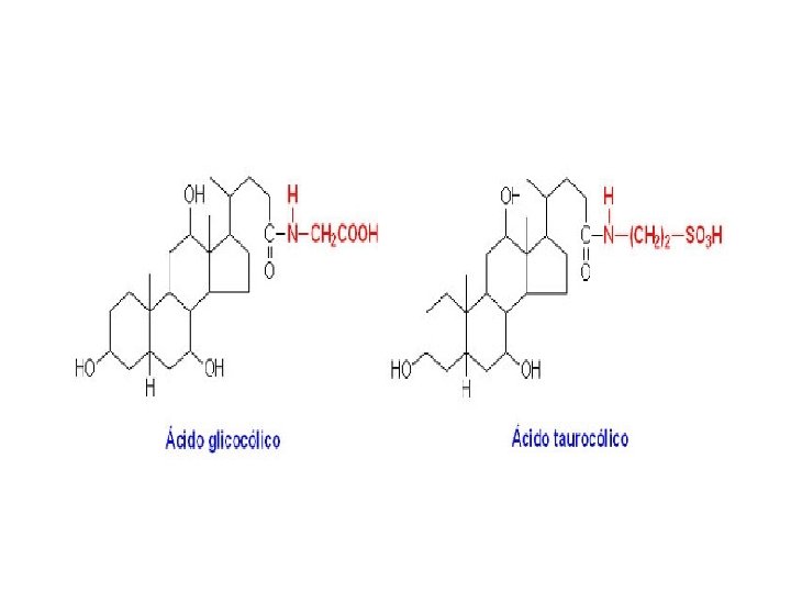 ÁCIDOS BILIARES. • SON UNAS MOLÉCULAS PRODUCIDAS POR EL HÍGADO A PARTIR DEL COLESTEROL. • DE ELLAS DERIVAN LAS SALES BILIARES QUE SE ENCARGAN DE EMULSIONAR LAS GRASAS EN EL INTESTINO DELGADO PARA FAVORECER LA ACCIÓN DE LAS LIPASAS Y LA POSTERIOR ABSORCIÓN INTESTINAL.
