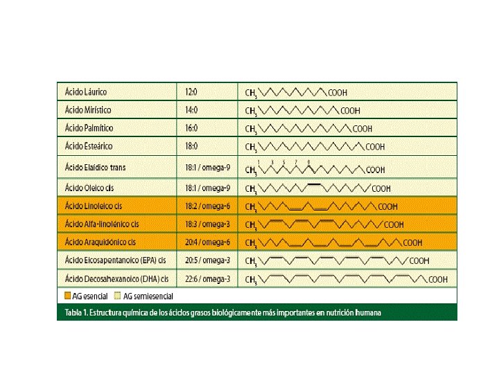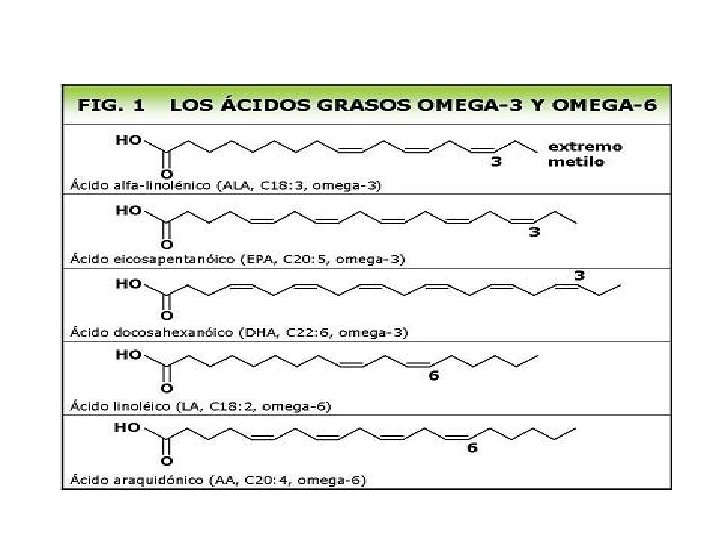ÁCIDOS GRASOS ESENCIALES • SON AQUELLOS QUE NUESTRO CUERPO NO PUEDE SINTETIZAR. DEBEMOS INGERIRLOS CON LA DIETA. • SON EL ÁCIDO LINOLEICO, EL ÁCIDO LINOLÉNICO Y EL ÁCIDO ARAQUIDÓNICO.