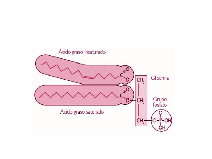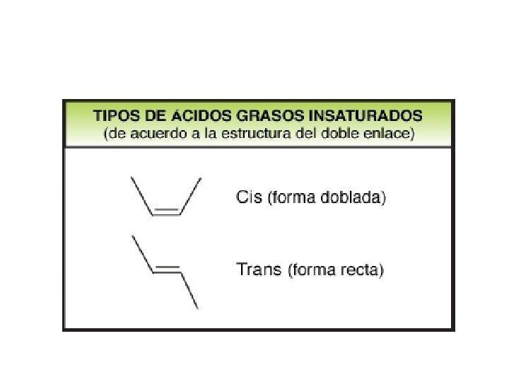 • LA CADENA DE CARBONOS: • ES SATURADA SI SOLO TIENE ENLACES SIMPLES. PALMÍTICO Y ESTEÁRICO. • ES INSATURADA SI PRESENTA UNO O VARIOS ENLACES DOBLES ENTRE ÁTOMOS DE CARBONO. OLEICO Y LINOLEICO.