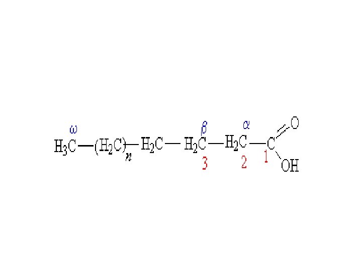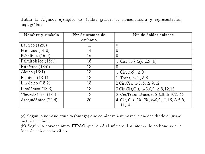NOMENCLATURA • LA NOMENCLATURA ABREVIADA ES MUY ÚTIL PARA NOMBRAR LOS ÁCIDOS GRASOS. CONSISTE EN UNA C, SEGUIDA DE DOS NÚMEROS, SEPARADOS POR DOS PUNTOS. EL PRIMER NÚMERO INDICA LA LONGITUD DE LA CADENA HIDROCARBONADA, MIENTRAS QUE EL SEGUNDO INDICA EL NÚMERO DE DOBLES ENLACES QUE CONTIENE.