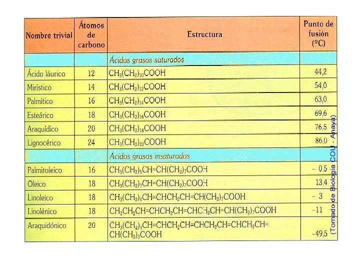 LOS ÁCIDOS GRASOS. • SON ÁCIDOS CARBOXÍLICOS FORMADOS POR LARGAS CADENAS CARBONADAS (A PARTIR DE 12 CARBONO), CON UN NÚMERO PAR DE ÁTOMOS DE CARBONO, EL ÚLTIMO DE LOS CUALES ES UN GRUPO CARBOXÍLICO. • TIENEN ENTRE 14 Y 22 CARBONOS. LOS MÁS ABUNDANTES SON LOS QUE TIENEN 16 Y 18 ÁTOMOS DE CARBONO.