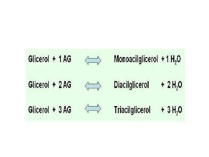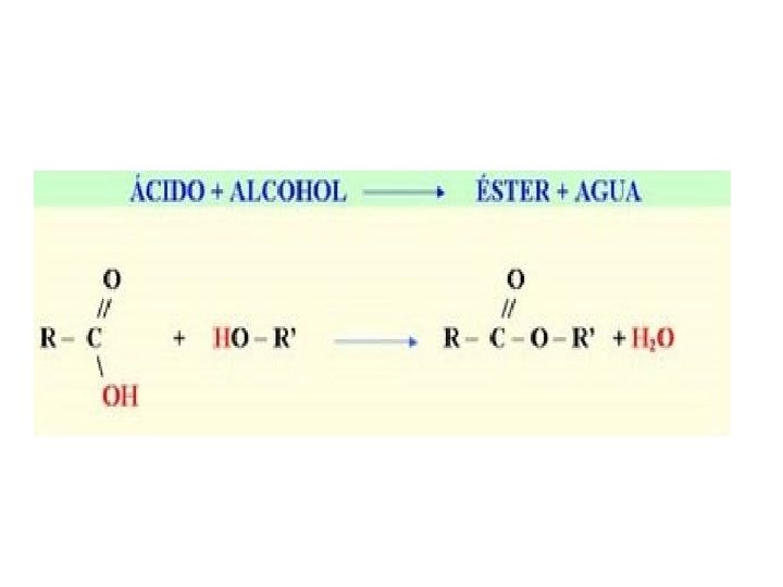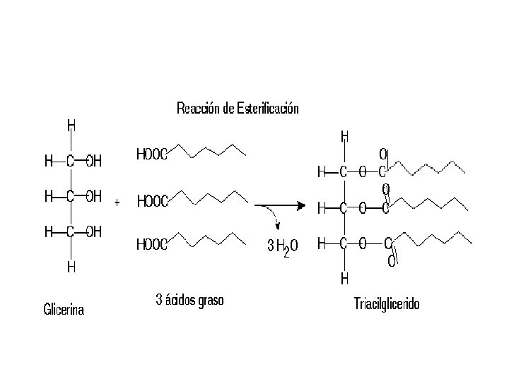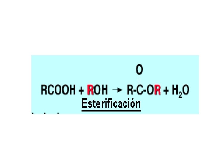 ESTERIFICACIÓN R-COOH + OH-R' ====== R-C-O-R' + H 2 O HIDROLISIS. • ac. graso + alcohol ==== éster + agua