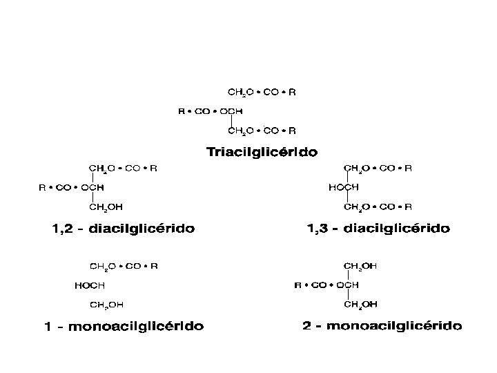 ACILGLICÉRIDOS O GRASAS • SON LOS ÉSTERES FORMADOS POR LA ESTERIFICACIÓN DE GLICERINA CON UNA DOS O TRES MOLÉCULAS DE ÁCIDOS GRASOS DENOMINANDOSE: MONOACILGLICÉRIDOS, DIACILGLICÉRIDOS Y TRIACILGLICÉRIDOS.
