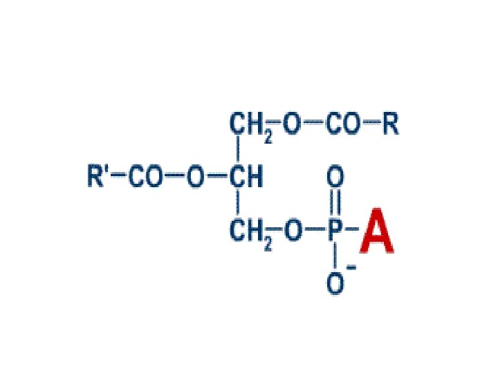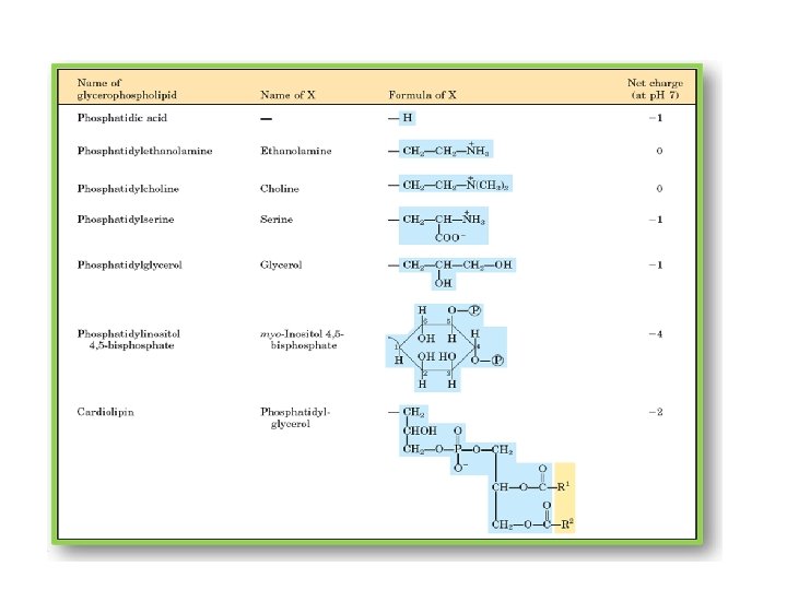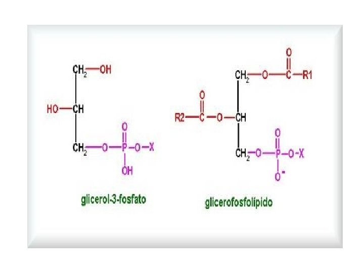 • COMPONENTES DE LAS MEMBRANAS, CONSISTE EN UN GLICEROL -3 - FOSFATO ESTERIFICADO EN C 1 Y C 2 POR ACIDOS GRASOS Y EN EL GRUPO FOSFORIL CON UN GRUPO X POLAR QUE ES GENERALMENTE UN DERIVADO DE UN ALCOHOL. (X= agua: ácido fosfatídico; X= etanolamina: fosfatidiletanolamina; X= colina: fosfatidilcolina (lecitina); X= serina: fosfatidilserina; X= myo-inositol: fosfatidilinositol; X= glicerol: fosfatidilglicerol y X= fosfatidilglicerol: difosfatidilglicerol (cardiolipina)).
