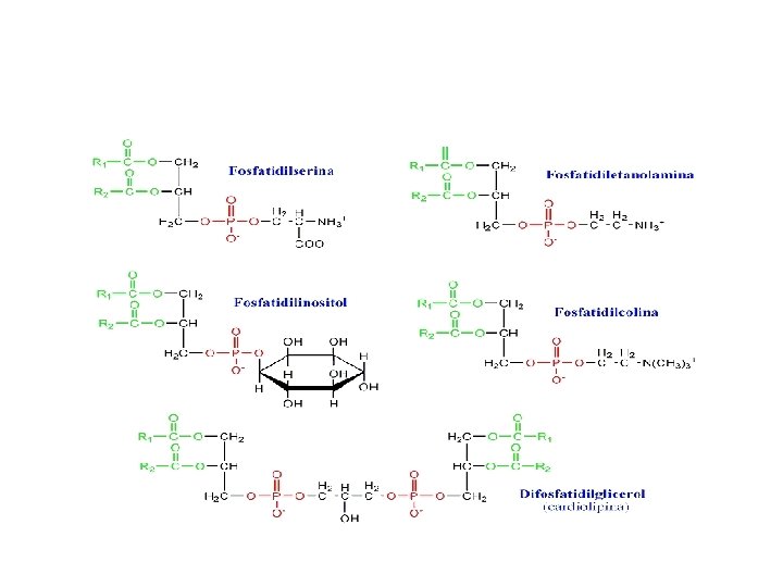 • SEGÚN EL ALCOHOL UNIDO AL GRUPO FOSFATO SE OBTIENEN DIFERENTES FOSFOGLICÉRIDOS: FOSFATIDILCOLINA: AC. FOSFATÍDICO+COLINA FOSFATIDILINOSITOL: AC. FOSFATÍDICO+INOSITO L FOSFATIDILETANOLAMINA: (ÁCIDO FOSFATÍDICO + ETANOLAMINA) FOSFATIDILSERINA: AC. FOSFATÍDICO +SERINA.
