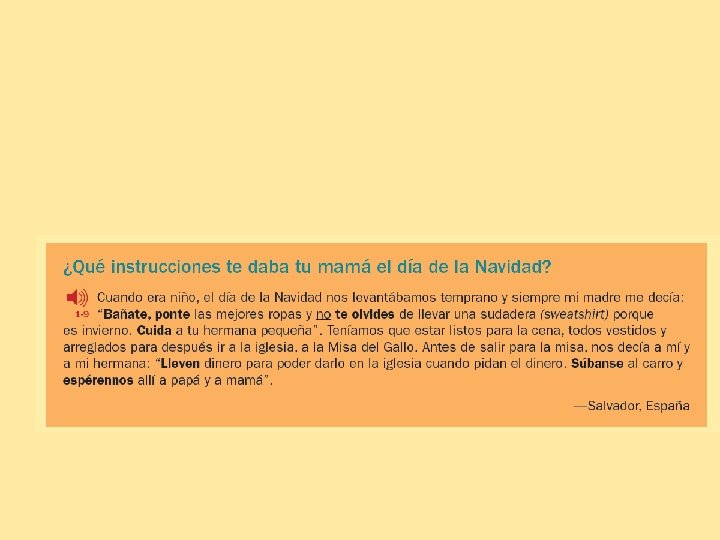 ¿Qué mandatos se escuchan? USTEDES EL profesor les dice a sus estudiantes: 1) Estudiar la gramática→ Estudien la gramática. 2) Hablar español en clase→ Hablen español en clase. 3) Hacer la tarea→ Hagan la tarea 4) Ser buenos estudiantes → Sean buenos estudiantes NOSOTROS Una abuela le dice a sus nietos: 1) Conservar nuestras tradiciones→ Conservemos nuestras tradiciones 2) Hacer una ofrenda → Hagamos una ofrenda. 3) Respetar a nuestros antepasados→ Respetemos a nuestros antepasados