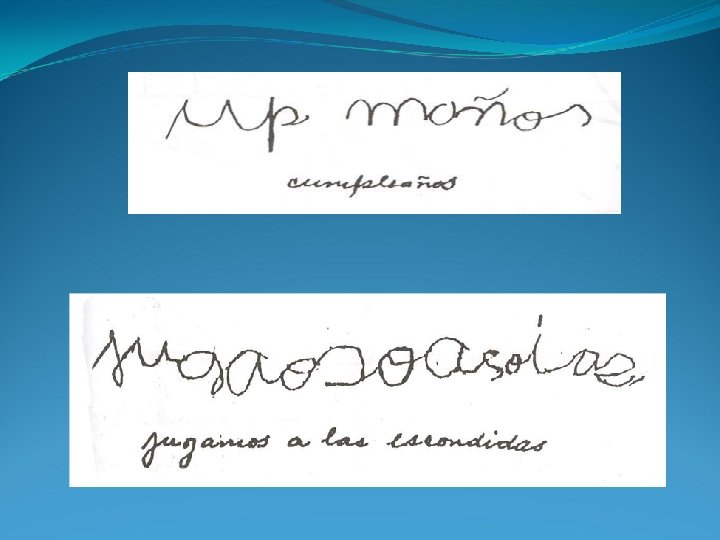Diferenciación entre dibujar y escribir Los niños para escribir ya no dibujan ni hacen trazos, es decir empiezan a colocar grafías indistintamente. Aparece el orden lineal Escriben sus grafías siguiendo una recta horizontal, exactamente como observa que escriben los adultos. Ejemplo: