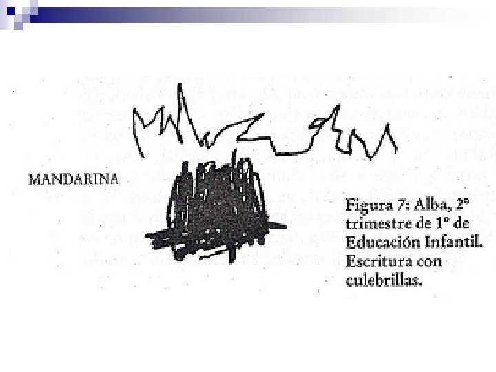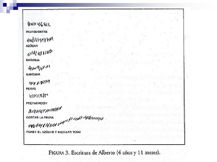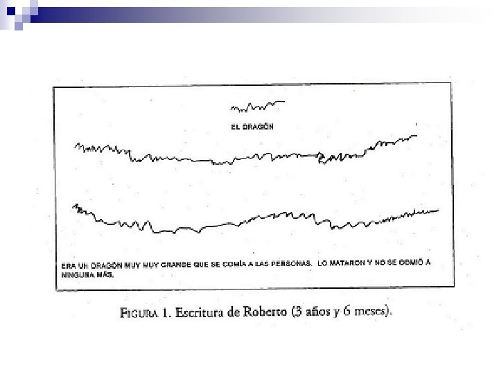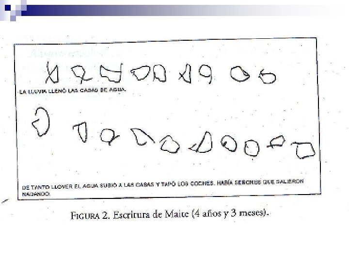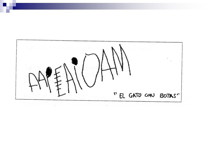 2. Escritura indiferenciada n n El niño distingue entre escritura y dibujo pero todavía no ha descubierto los criterios que permiten distinguir diversas cadenas escritas. En este momento escribir es reproducir los rasgos típicos de la forma de escritura que el niño, en una nueva hipótesis, identifica como forma básica: grafismos curvos y rectos separados entre sí para la letra de imprenta ¨ líneas onduladas ligadas y continuas para la letra cursiva. ¨ n A pesar del uso de “grafías” indiferenciadas, cada niño es capaz de interpretar su propia escritura pero no la de los demás.