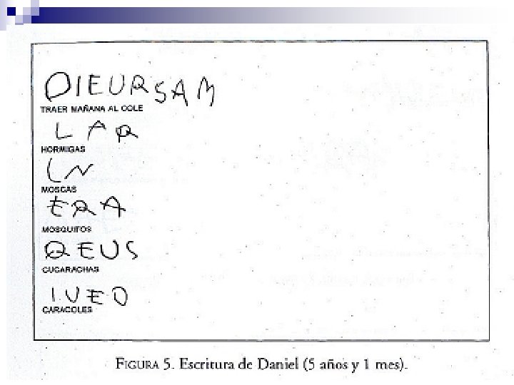 4. 3. Nivel silábico n La hipótesis en este nivel es asociar cada unidad de sonido a una grafía. Puesto que la primera unidad de sonido que el niño percibe es la sílaba, éste utilizará una letra o pseudoletra por cada sílaba de la palabra representada. Las cadenas escritas que podemos encontrar en este nivel van desde un control simplemente cuantitativo (tantas grafías como sílabas, sin ninguna relación cualitativa entre ellas) hasta una total correspondencia cuantitativa y cualitativa.