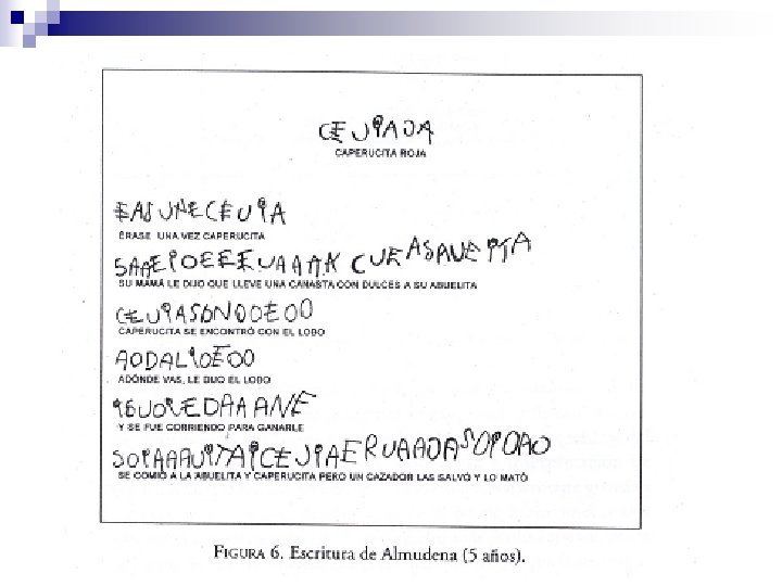 4. 2. Nivel alfabético n El niño capta la naturaleza de la escritura alfabética y realiza una correspondencia estricta de una letra para cada fonema. Progresivamente irá superando los problemas de las sílabas que no corresponden al esquema básico consonante + vocal (sílabas trabadas, inversas y complejas) hasta adquirir un dominio básico del código de escritura, cuyo último obstáculo será el de la ortografía.