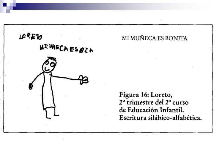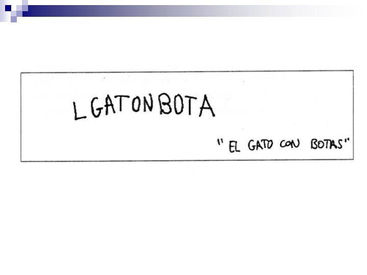 Nivel silábico n La hipótesis en este nivel es asociar cada unidad de sonido a una grafía. Puesto que la primera unidad de sonido que el niño percibe es la sílaba, éste utilizará una letra o pseudoletra por cada sílaba de la palabra representada. Las cadenas escritas que podemos encontrar en este nivel van desde un control simplemente cuantitativo (tantas grafías como sílabas, sin ninguna relación cualitativa entre ellas) hasta una total correspondencia cuantitativa y cualitativa.