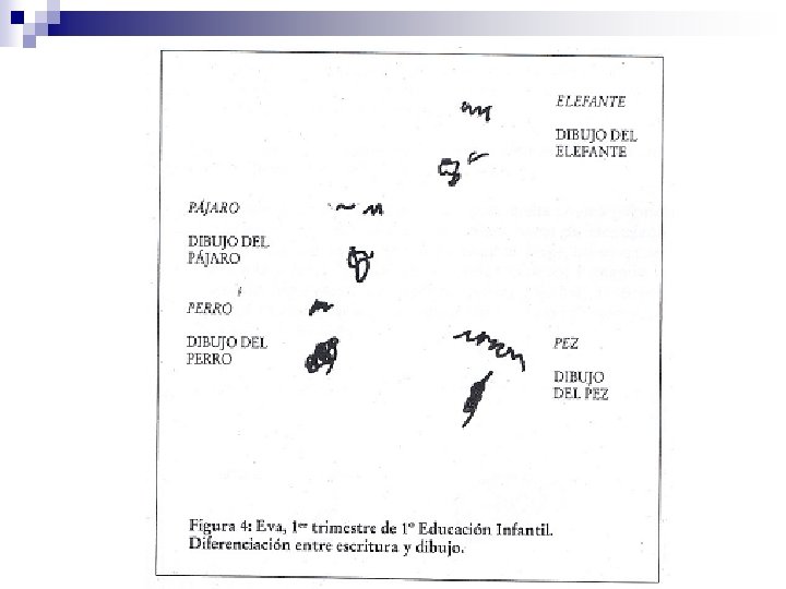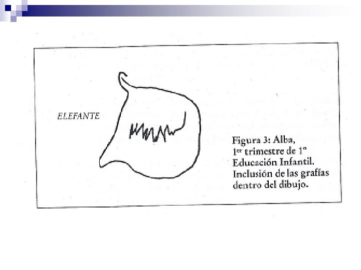 1. Etapa de indiferenciación gráfica. El niño aún no diferencia entre escritura y dibujo. n Utiliza las mismas formas para dibujar y para “escribir” n